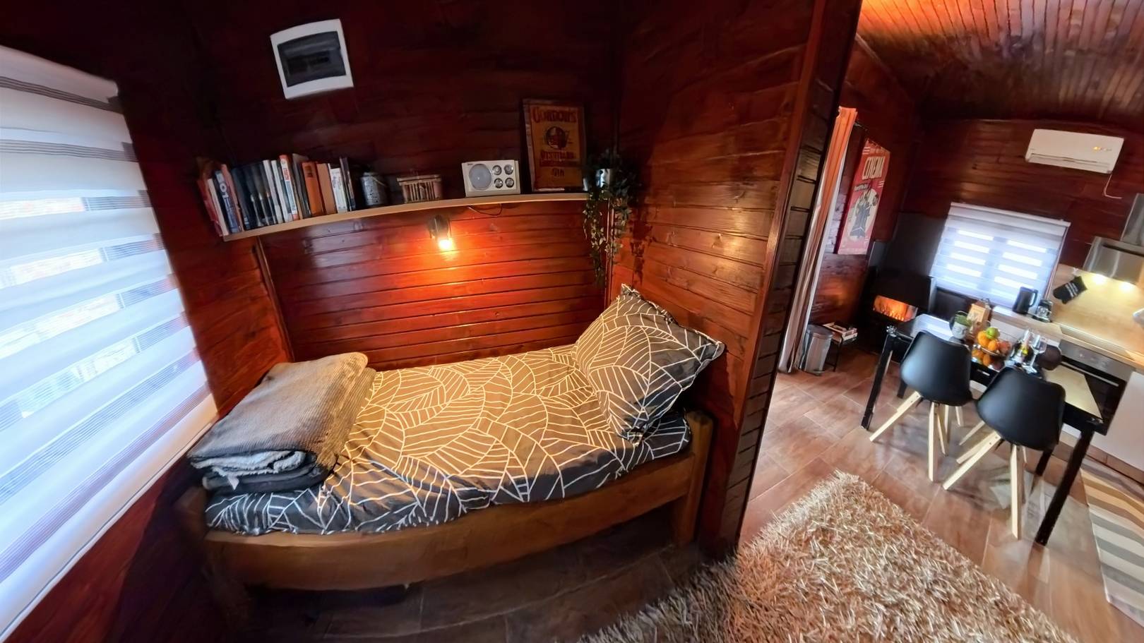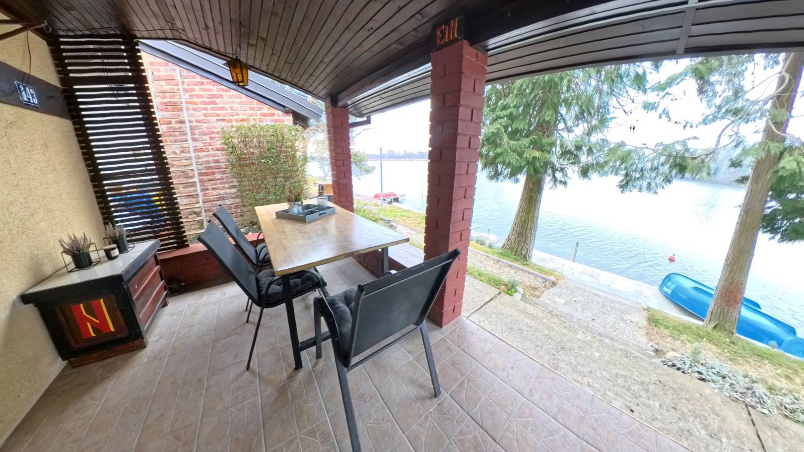 Kuća za odmor smještena je uz samo jezero, nekoliko koraka od obale i sigurni smo da će Vam pogled sa terase i zalaske sunca zauvijek ostati u sjećanju. Kuća je opremljena s 4 ležaja (plus 1 pomoćni ležaj na zahtjev gosta), kupaonicom, unutarnjom kuhinjom, televizorom, klima uređajem, kaminom na drva, dvije vanjske terase – velika prednja terasa sa zidanom pekom i bočna terasa (obje sa direktnim pogledom na jezero) te privatnim parkiralištem za 3 automobila odmah iza kuće.